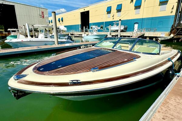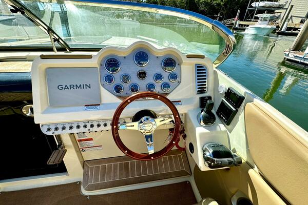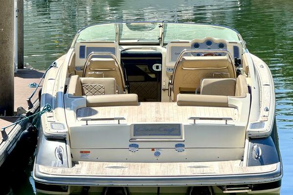 Step aboard and you’ll find an inviting, social cockpit with wraparound lounge seating, a double-wide helm seat to share the view, and a sun-pad over the engine hatch—an effortless setup for sandbar days, harbor tours, or twilight cruises. Fit and finish are unmistakably Chris-Craft: hand-finished teak, diamond-stitched upholstery, and robust hardware throughout. A compact cuddy forward with marine head and berth/storage adds real utility for quick changes, kids’ naps, or stowing gear.